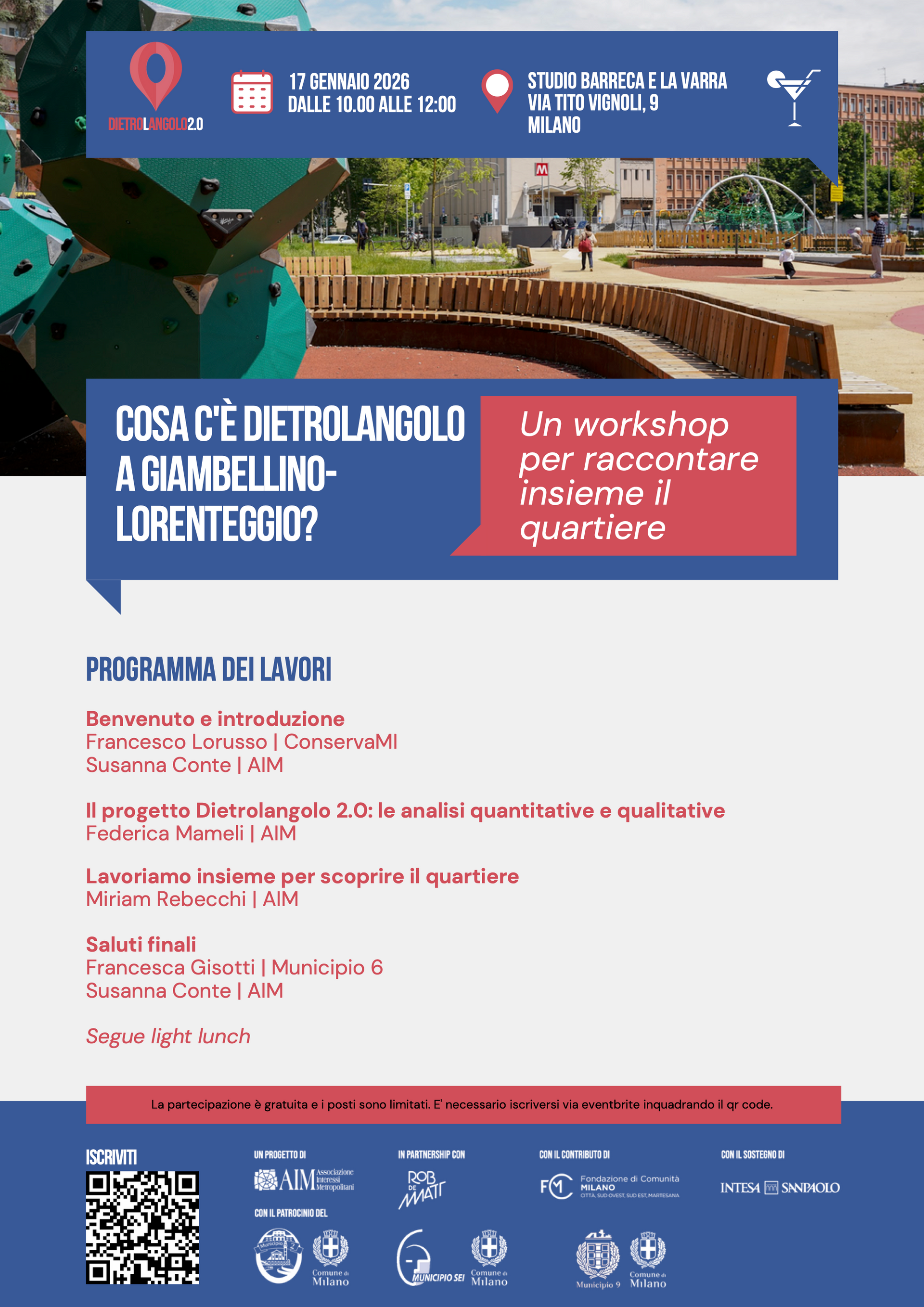 "Dietrolangolo 2.0" organizza, sabato 17 gennaio 2026, presso lo studio Barreca e La Varra, dalle 10 alle 12, il workshop "Cosa c'è Dietrolangolo a Giambellino-Lorenteggio": un incontro per confrontarci con il quartiere sui risultati delle ricerche svolte.